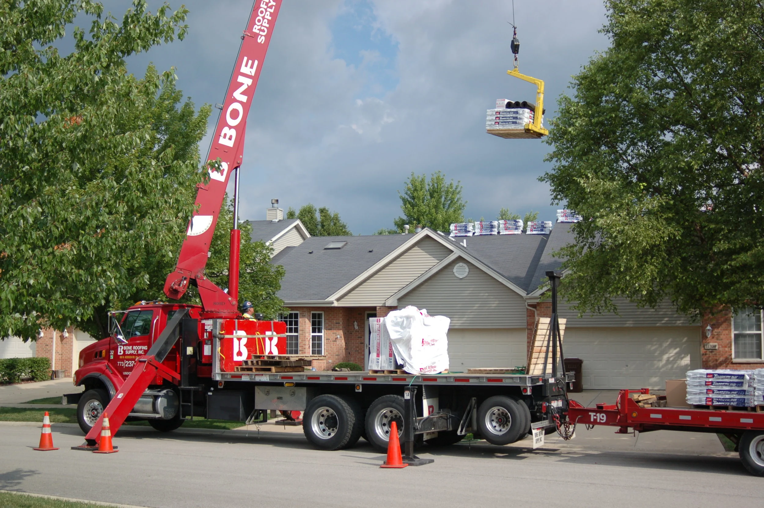 Whether it’s a large job or a small one, getting a full set of roofing supplies placed on the roof is a service that we offer to our contractors. Our knuckle cranes can reach buildings of up to 3-stories while in the tightest of spots, while our stick cranes can reach up to 5-stories. Our cranes eliminate the need for the contractor to rent their own cranes at exacerbating rates to meet their needs.